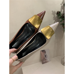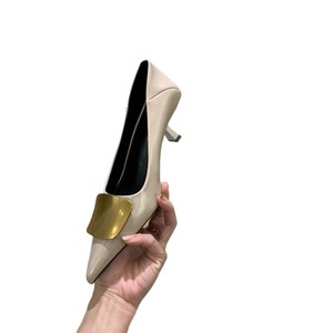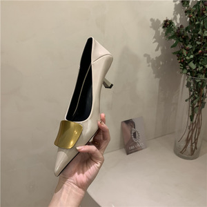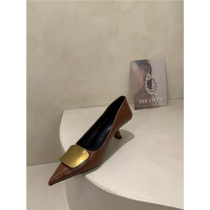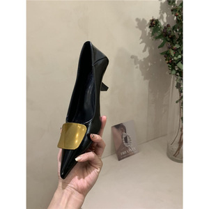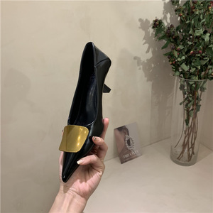春のローヒールフレンチポインテッドトゥブラックハイヒールレディーススティレットヒールエレガントレディースパンプスメタルバックルワークシューズ