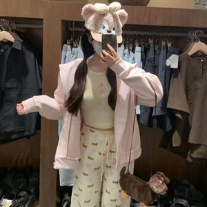 初秋のスウェットシャツライトピンクジャケット春と秋の薄い 2025 ジッパー新しいフード付き怠惰なカーディガンルーズトップ女性のための
