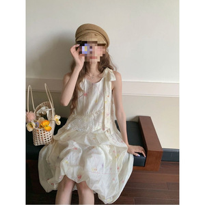 森ガール甘いニッチ年齢軽減リボン花柄ノースリーブドレス夏ルーズ痩身ベスト花のつぼみスカート