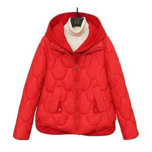 2025 新韓国スタイル偽ツーピース綿服女性のショートフード付き冬厚みのある小さなパッチワークジャケット在庫あり