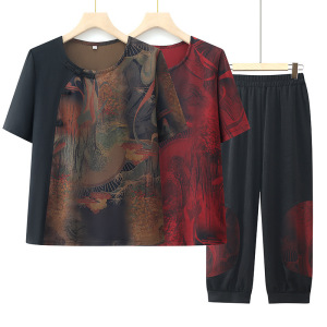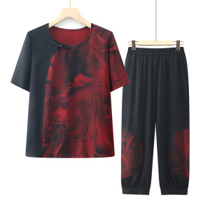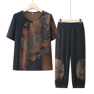 大きいサイズの母親のスーツ女性のための 100kg 夏の新しいラウンドネックカラー中高年国民風バックルルーズスーツ