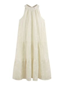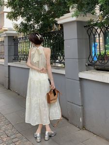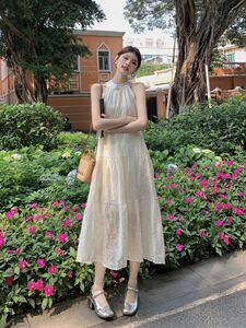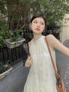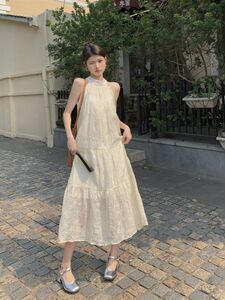 女性用小柄なリゾート風ロングスカート、フレンチ風ホルターネックスカート、夏用シフォンドレス、優しい風刺繍Aラインスカート