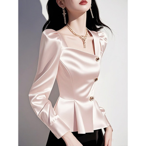 ピンクのアセテートシャツ、ハイエンド、軽い高級感、見栄えが良く、ユニークで美しい気質、女性用スクエアネック長袖トップス、2025年春