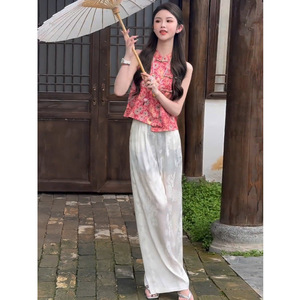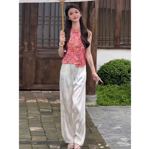 新しい中国風ピンクジャカードベストルーズパンツスーツ夏のハイエンドユニークな年齢軽減気質ツーピースセット