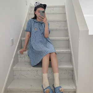 キティ新しいブルーパジャマ女性のルーズテンセル綿半袖ネグリジェ夏 2022 新しいヒョウ柄ホーム服