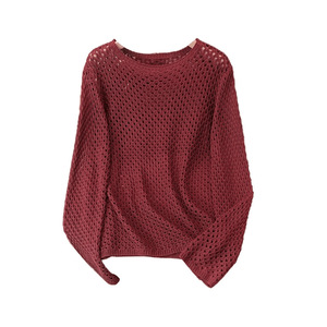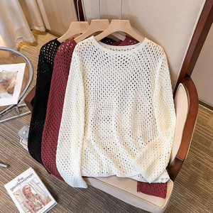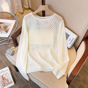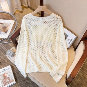 2025年新作女性用中空ニットセーター、ゆったり、スリム、万能長袖トップス、春秋薄手日焼け防止ブラウス