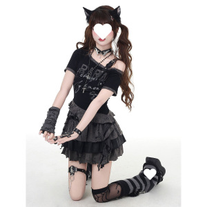 夜神之月亚文化露肩小众设计短款修身上衣T恤半身裙套装辣妹小众