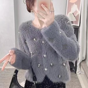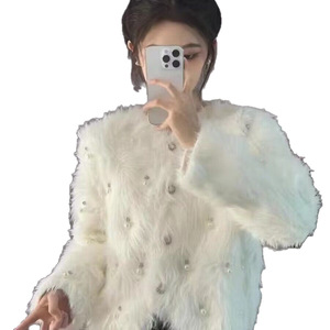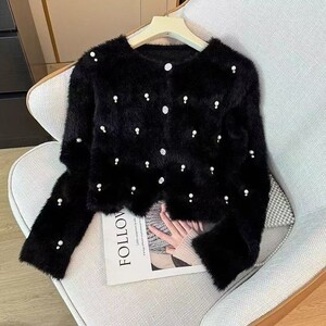 秋冬デザインの高級感あるフェイクミンク、ビーズ刺繍入り、香風系、厚手、上品なショート丈ニットセーター(レディース)、ラインストーン付き