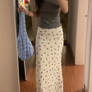 韓国白夏休みリボンプリントレースハイウエスト花柄フィッシュテールスカートロングスカート痩身スカート