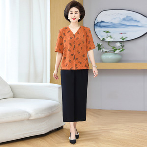 中高年女性の夏服プラスサイズプラスサイズ 100kg デブママレディース半袖 Tシャツファッションスーツ中年ツーピース