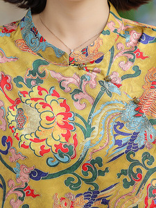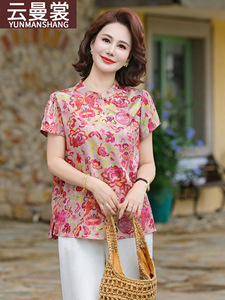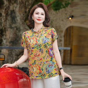 夏の新しいスタイルの新しい中国風の半袖トップス、中高年の母親向けの気質、女性向けのレトロなサテンプリントトップス