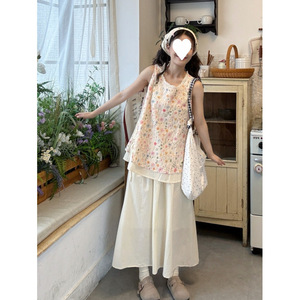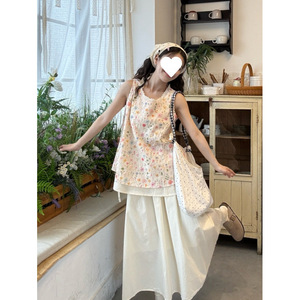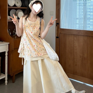 花柄プリントの小さなフレッシュベスト女性のための夏の2025新しいレーススプライシングラウンドネック甘いレースアップノースリーブトップ