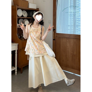 花柄トップス+アプリコットスカート