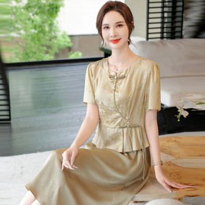 ママのサマードレス、新しいスタイルのチャイナドレス、中高年女性のファッショナブルな夏の半袖フェイクツーピースドレス