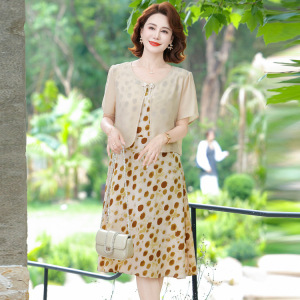 おしゃれな年齢軽減カラーブロックフェイクツーピースママドレス2025夏新スタイル中高年女性洋風ドレス