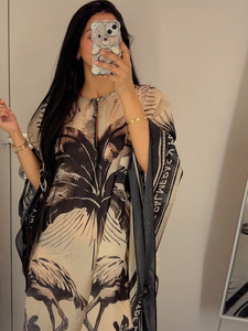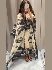 2025 春夏レディースクロスボーダー AliExpress 人気カジュアルルーズラウンドネックフレアスリーブプリントドレス大きな裾スカート