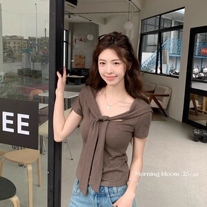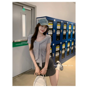 パープルピュアセクシースクエアネック半袖Tシャツ女性用2025夏薄いスリムホットガールショールトップ