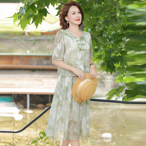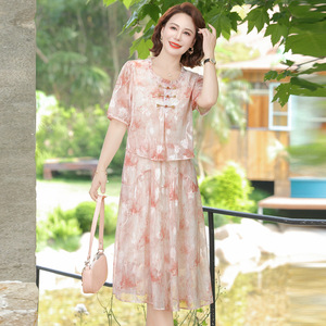 新しい中国風のママサマードレス、中高年女性のためのファッショナブルな新しい夏のシフォンスカート、半袖フェイクツーピーススカート