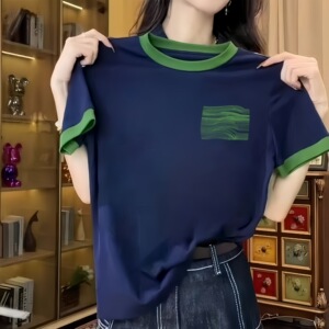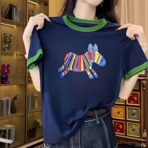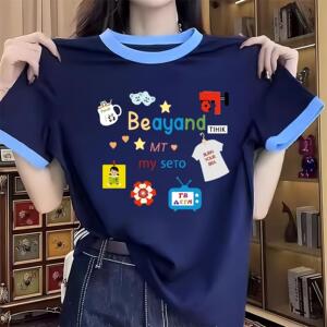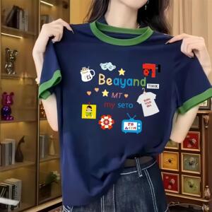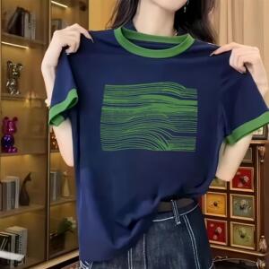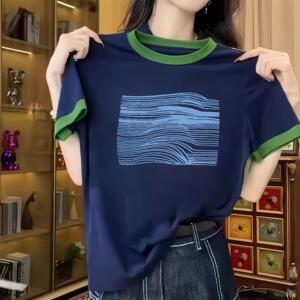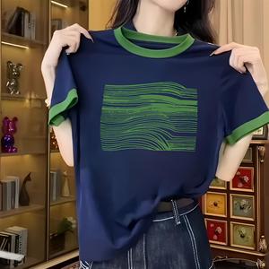 純綿右肩痩身コントラストカラー半袖Tシャツ女性用2025新しいホットスタイルプリントファッショナブルで多用途なトップス