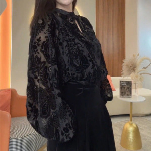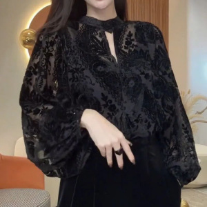 女性用リバーシブルレース長袖シャツ、高級気質、中空メッシュステッチ、植毛、年齢軽減ボトムストップ