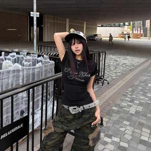 【210g 40番手純綿】ホットダイヤモンドレターラウンドネックスリム半袖レディース新作ラグランスリーブTシャツアメリカントップス