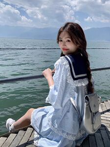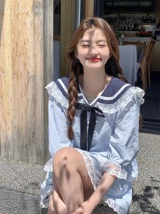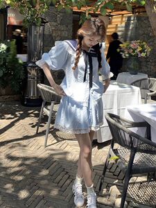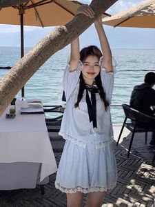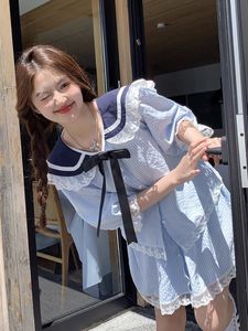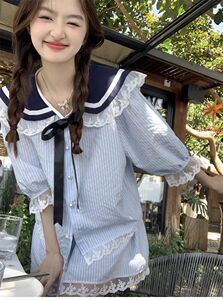 太った女性向けの甘くて若々しい、コントラストカラーのネイビーカラーの襟とリボン付きシャツとレースのスカートのファッショナブルなセット