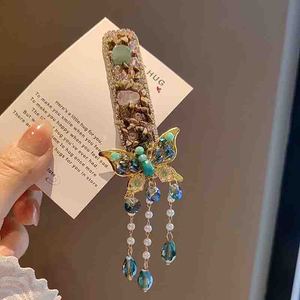 新しい中国風グリーンフラッシュダイヤモンド蝶タッセルヘアピンエスニックスタイル小さな新鮮な前髪サイドクリップ帽子女性用