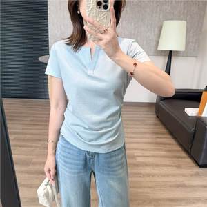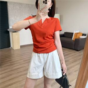 宝物Tシャツ!アセテートシルクスタックカラーTシャツ、薄くて硬い、ウエストが小さく、プリーツ、右肩痩身、半袖通気性トップ