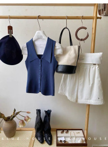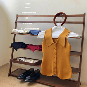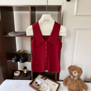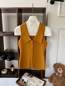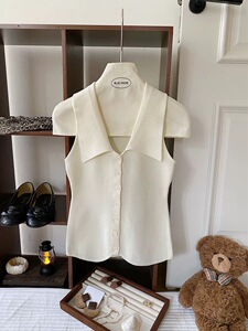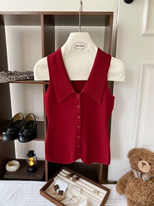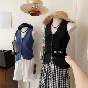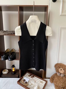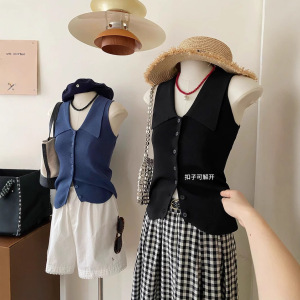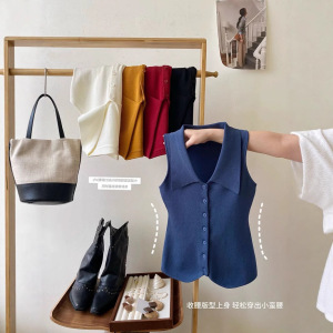 智性藏青色复古polo翻领针织坎肩背心女修身气质开叉无袖背心上衣