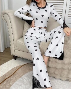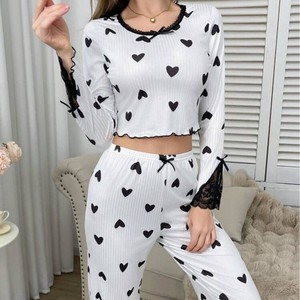 国境を越えたヨーロッパとアメリカの売れ筋ホームウェアカールラブラウンドネック長袖パジャマ女性用、ズボンの外でも着用可能、ツーピーススーツ