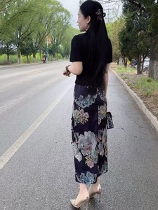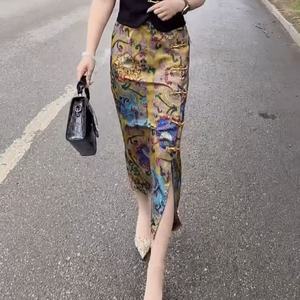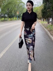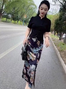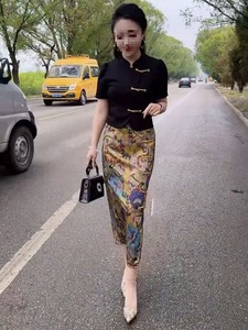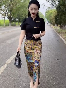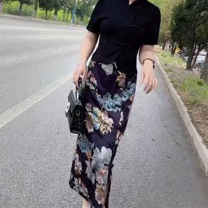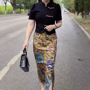 新しい中国風のレトロなボタンジャカードスカート新しいスリムフィット半袖トップ+スカート2点セット