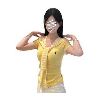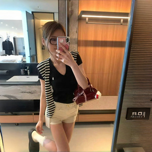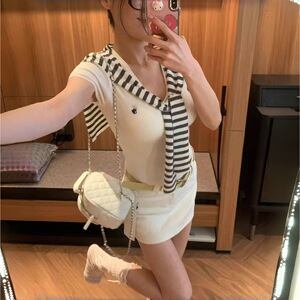 Vネック半袖ニードルストライプ肩掛け2点セット夏に見栄えの良い刺繍ニット半袖フェミニントップス