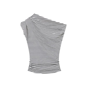 ストライプオフショルダー斜め襟半袖Tシャツ女性用夏ホットガール純粋な欲望スタイル痩身気質美しいトップトレンディ
