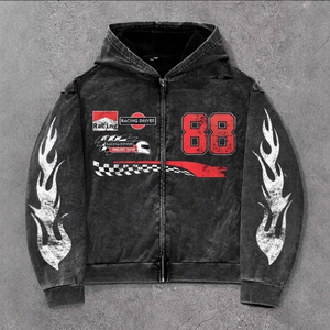 ヨーロッパとアメリカの国境を越えたアメリカン レトロ ジッパー フード付きスウェットシャツ プリント ストリート ダーク ユニセックス ルーズ ダメージ ジャケット