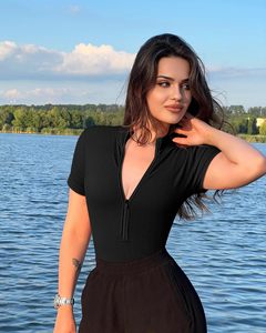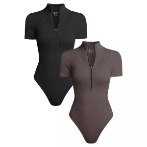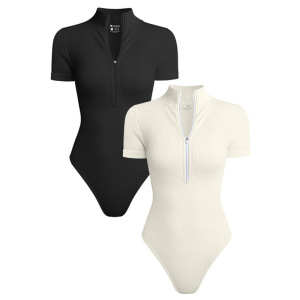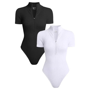 Amazon クロスボーダー レディース ボディスーツ セクシー リブ ワンピース 半袖 フロント ジッパー 三角形 ボディスーツ