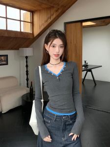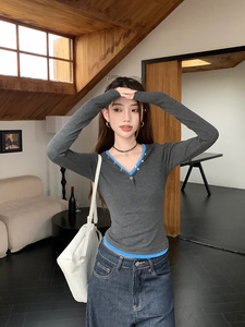 韓国グレー偽ツーピース V ネック T シャツ女性のための初秋シックな甘いホットガールデザインスリムボトムシャツショートトップ