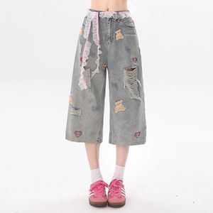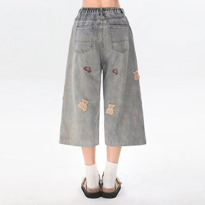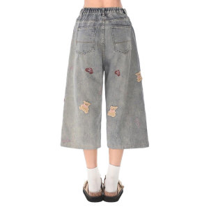 ハイウエストアメリカンリップドジーンズレディースクマ刺繍デザインプラスサイズレディースルーズファットmmスリムワイドレッグパンツ