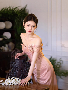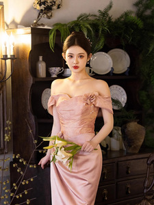 ワンショルダーイブニングドレス、気質宴会結婚式花嫁乾杯ドレス2025新作ライトラグジュアリーニッチ婚約ドレス