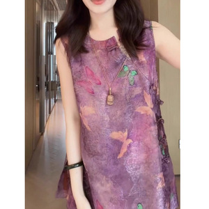 新しい中国風の蝶染め紫スタンドカラーボタンノースリーブベスト女性のための 2025 夏の新しいチョッキトップ