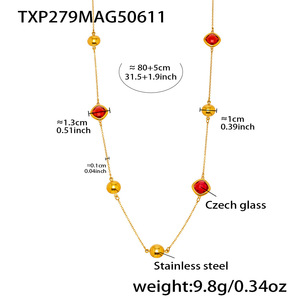 TXP279-ゴールデンレッドガラスストーンネックレス80+5cm
