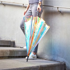 工場卸売透明マジックカラーロング傘レーザー傘ストレートポール半自動傘印刷パターンロゴ
