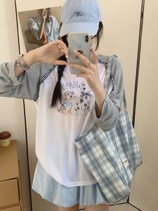 韓国日焼け止めレディーストップスニッチデザインコントラストカラールーズ長袖ボトムシャツラグランスリーブTシャツ女性用