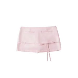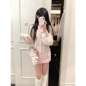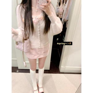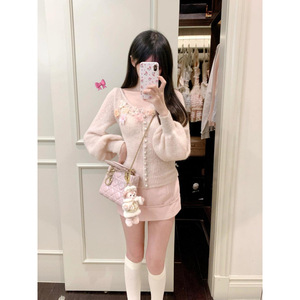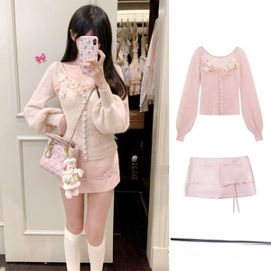 女性用春ピンクの優しい風の花のセーター薄手の長袖トップとリボンヒップスカートの2点セット