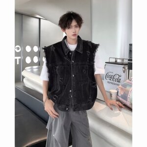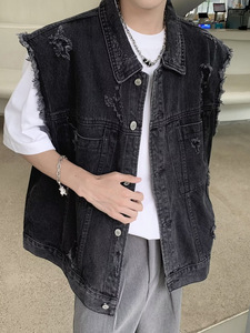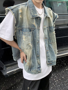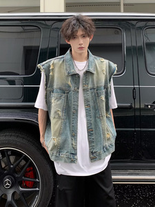 アメリカンウォッシュデニムベストメンズ秋ブルールーズカジュアル多用途ハンサムダメージ加工ノースリーブベストジャケット