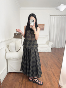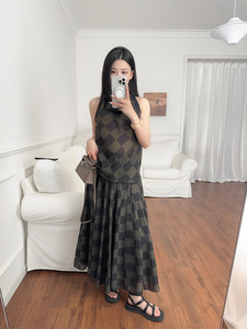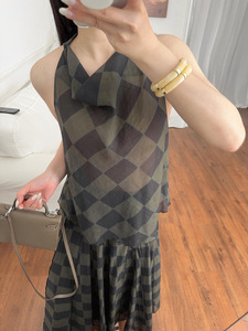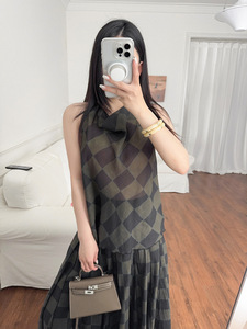 MD25 レディース 英国風 通勤風 ドレープチェック柄 ノースリーブ トップス ダイヤモンド ホルターネック 05231885