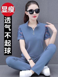 ローズレッドアイスフィールスポーツスーツ女性用初夏2025新しいママファッショナブルな朝のランニングエアロビクス半袖ズボン