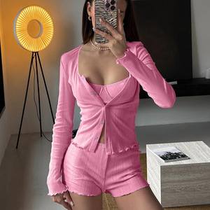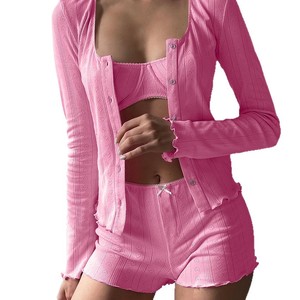 クロスボーダーヨーロッパとアメリカンスタイルの新しい肌に優しい長袖カーディガン下着ショーツ3点セット快適で通気性のあるパジャマ女性のホーム服