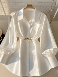 春の新作無地ランタンスリーブシャツシックなメタルガードルデザインニッチトップ