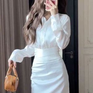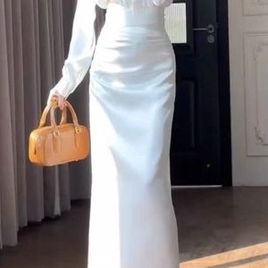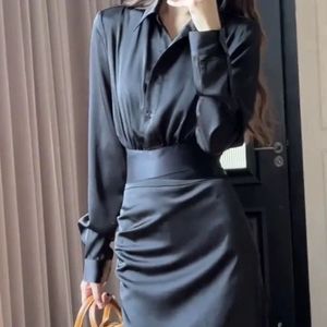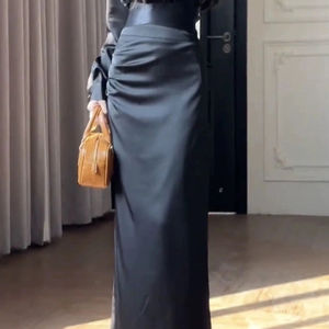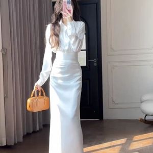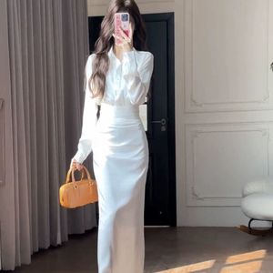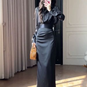 法式感缎面蚂蚁腰长袖翻领衬衫高腰修身半身裙显瘦长裙套装女