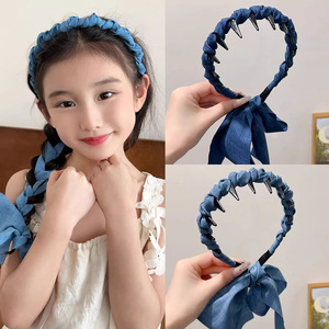 子供用デニムレトロリボン歯コームヘッドバンド、女の子用ヘアタイ、小さな女の子用編み込みヘッドバンド、高頭頂ヘアアクセサリー